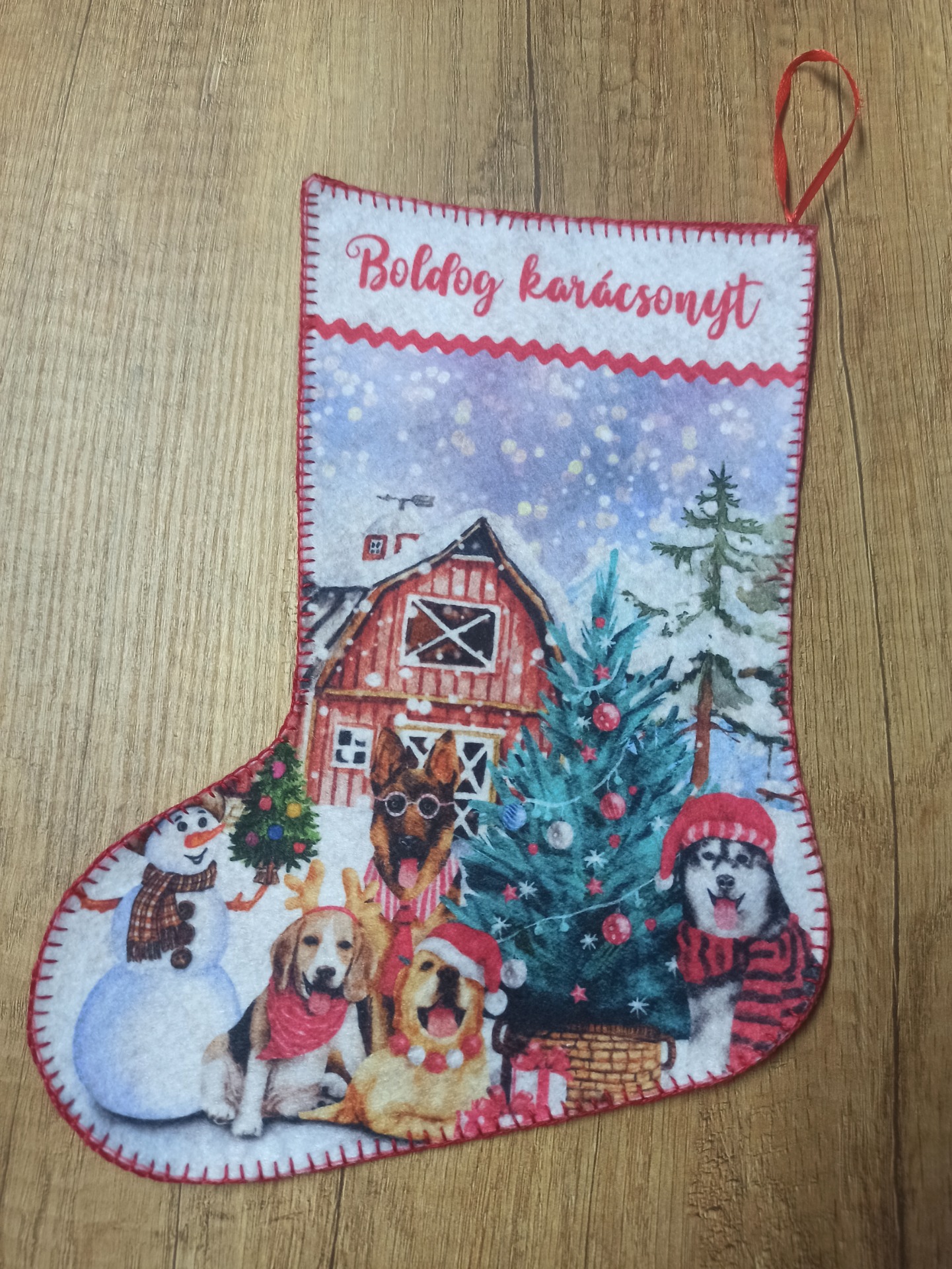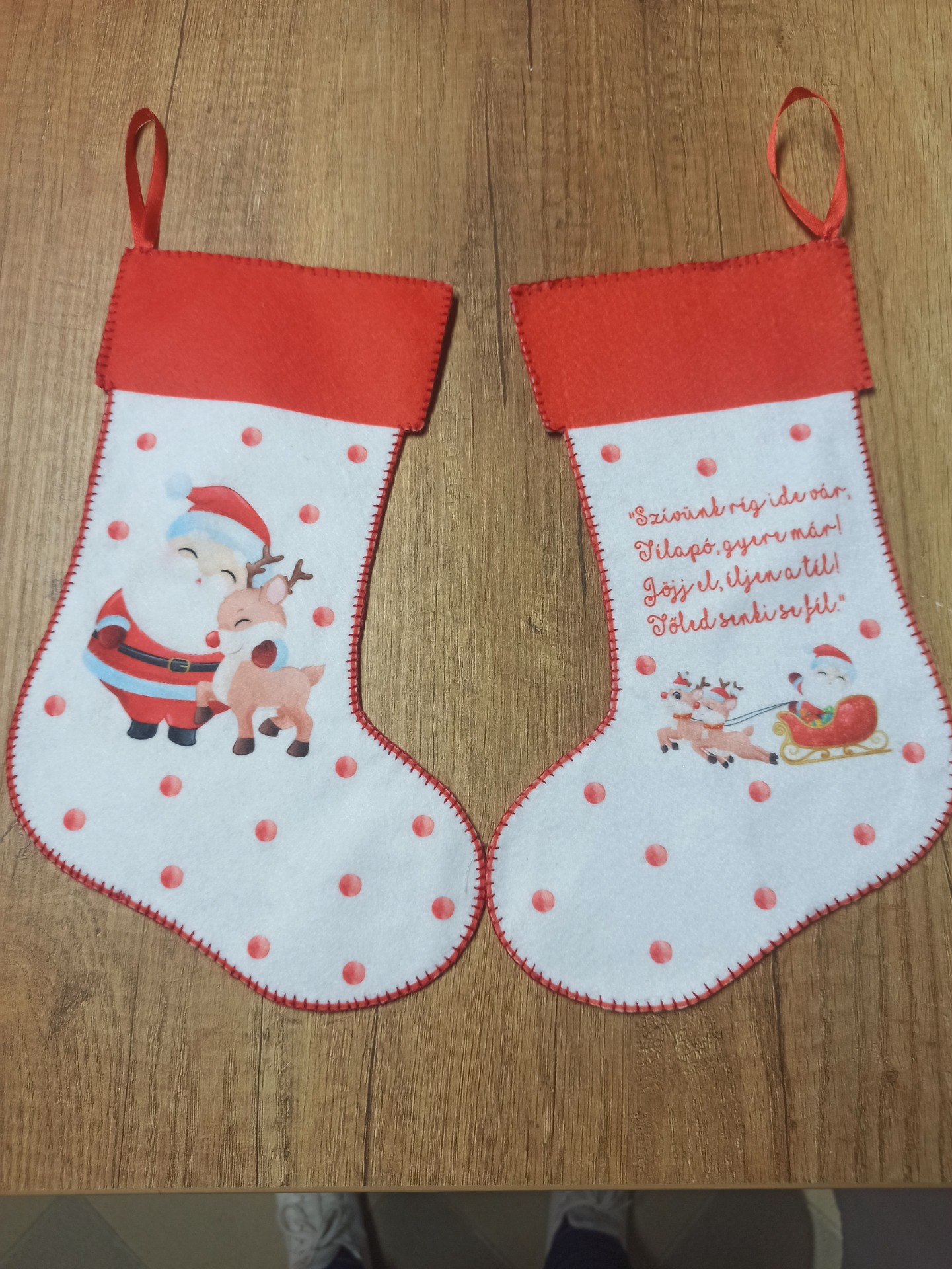 Filc anyagból készült Mikuláscsizma, mérete 11x25cm. Mosható, többször használható. Az anyag mintája az aktuális készletből választható.